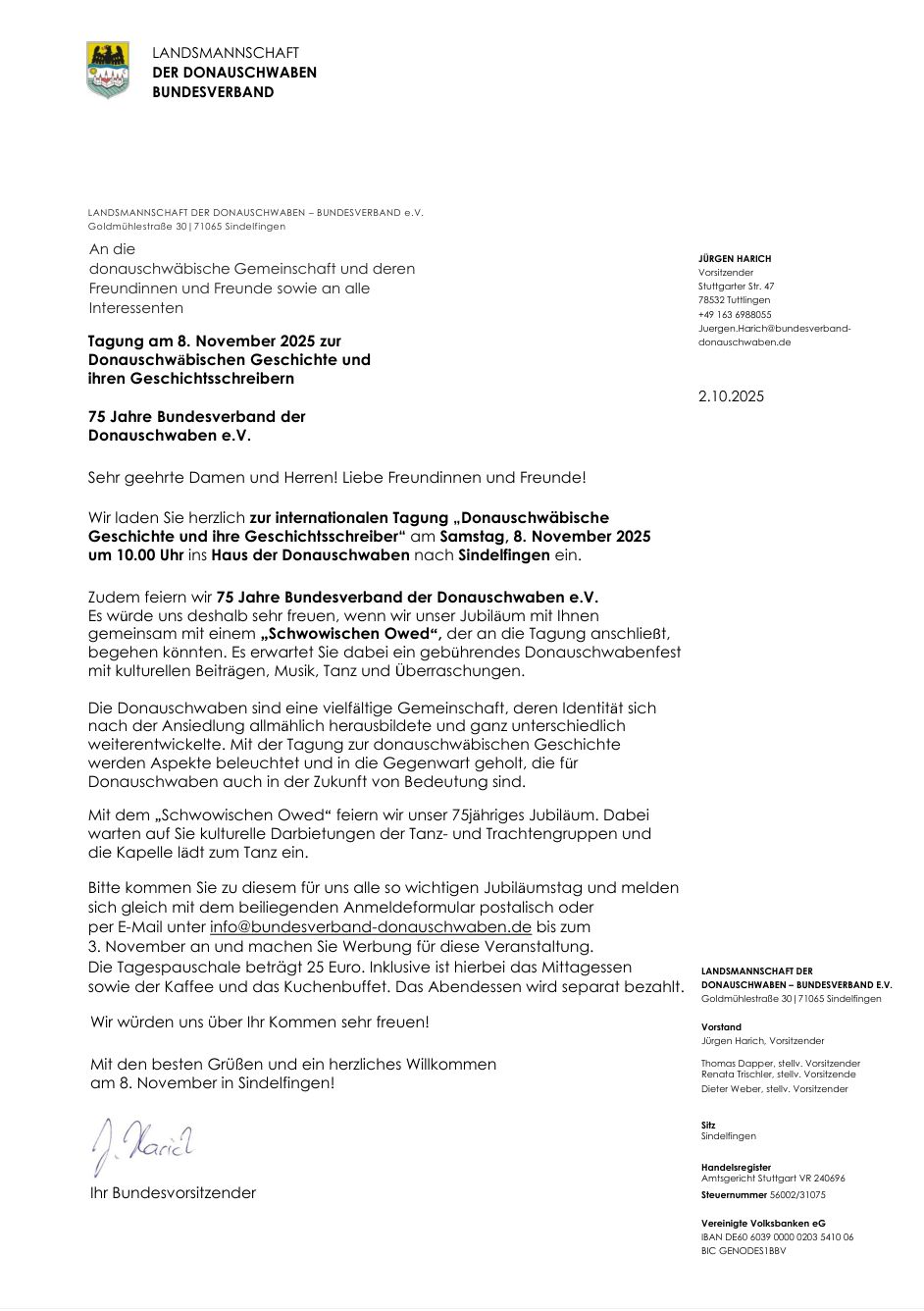 Wir laden Sie herzlich zur internationalen Tagung „Donauschwäbische Geschichte und ihre Geschichtsschreiber“ am Samstag, 8. November 2025 um 10.00 Uhr ins Haus der Donauschwaben nach Sindelfingen ein.